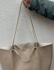 Tasken kommer med to forskellige stropper, så den både kan bæres som skuldertaske- og håndtaske. Der medfølger en stor clutch i tasken.
